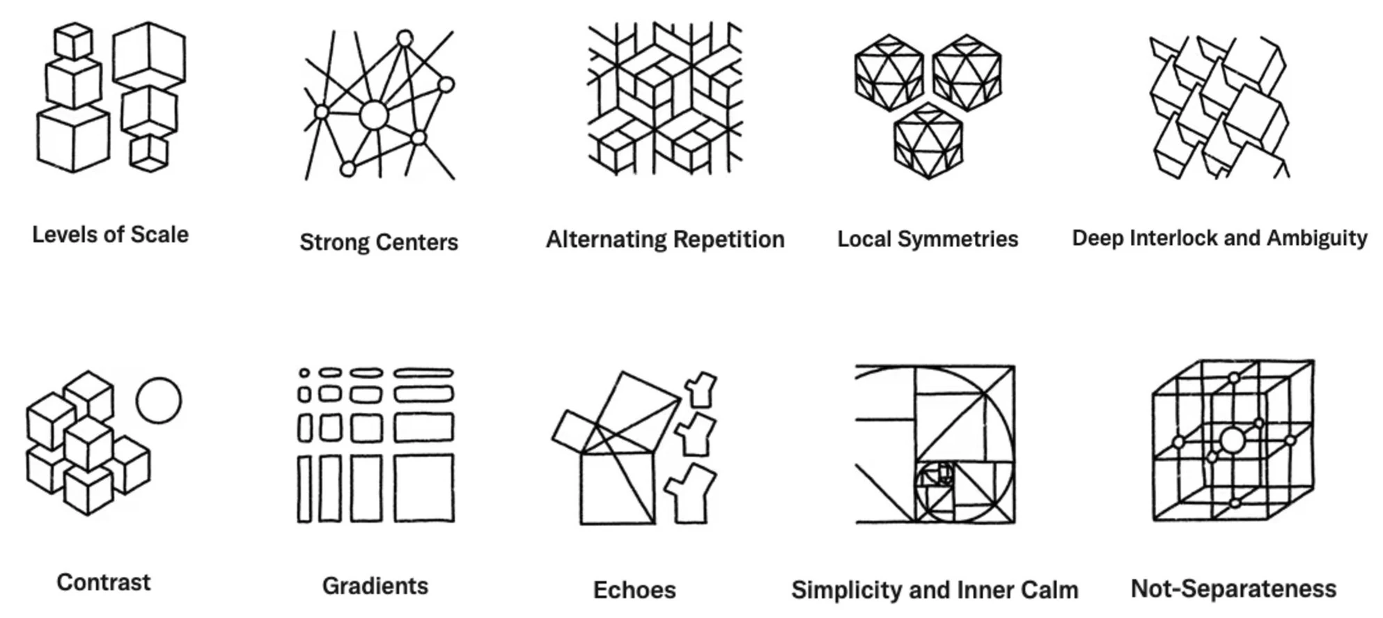 Alexander tried to describe this 'something more' in several ways. Speaking most directly to architects, planners, and designers of human spaces, he used terms like 'aliveness.' He asked: how can we humans design and create spaces that feel 'more alive'? He hoped designers would begin to use his properties of wholeness in their designs. He hoped this would add strength, boldness, beauty, and aliveness to human creations, helping them to be more aligned with their surrounding environment, more unified with (or even indistinguishable from) the surrounding wholeness of the world.